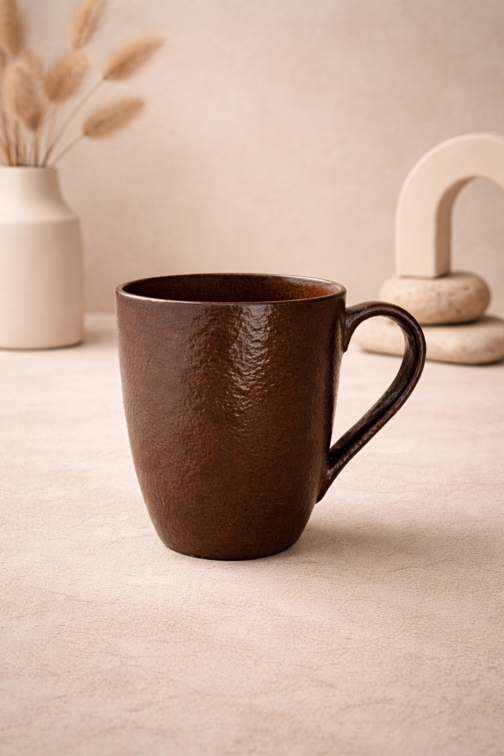 A deep brown textured mug crafted for slow mornings and mindful sips.Its earthy tone and tactile finish bring warmth to your daily coffee ritual.